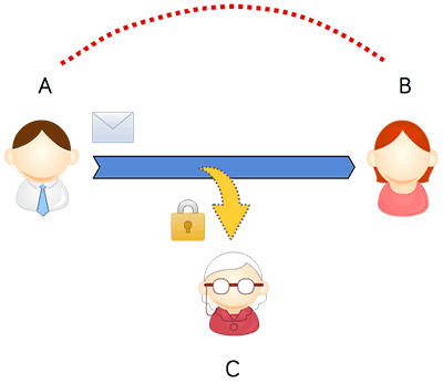 Cryptoniouz repose sur une idée simple : A envoie un message important à B. Ce message ne doit être lisible par C, même si par accident cela lui tombe entre les mains.